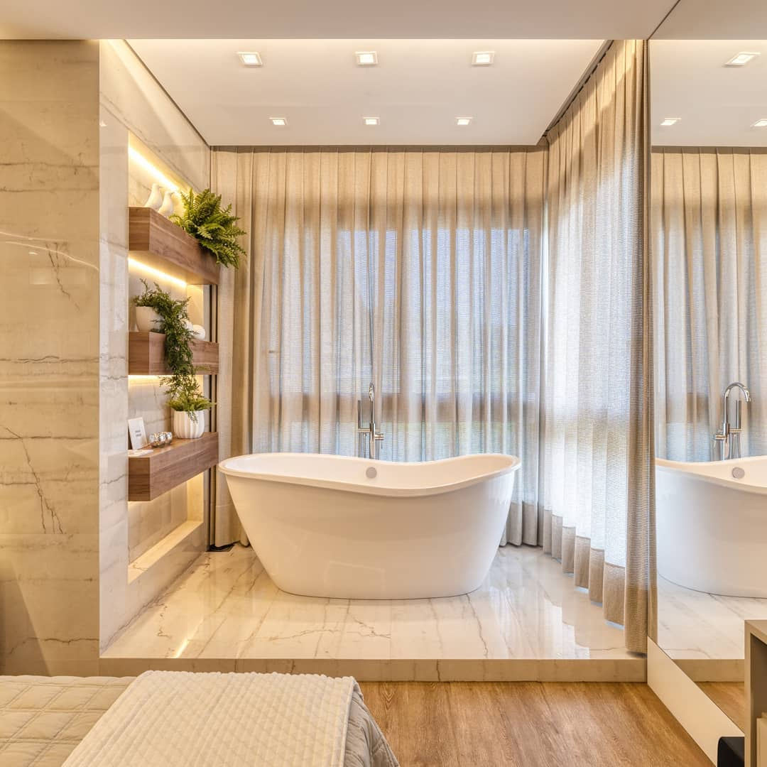 Quarto de casal contemporâneo com cores claras e banheira de imersão!
