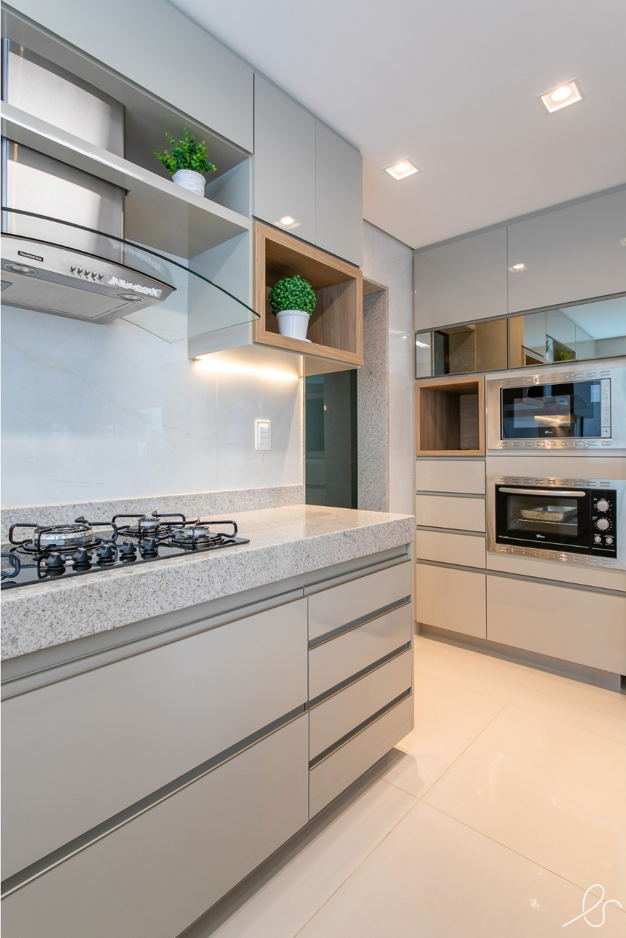 A marcenaria toda em tom de cinza claro (cinza Itália), valorizou a bancada e península em granito Siena dessa cozinha.