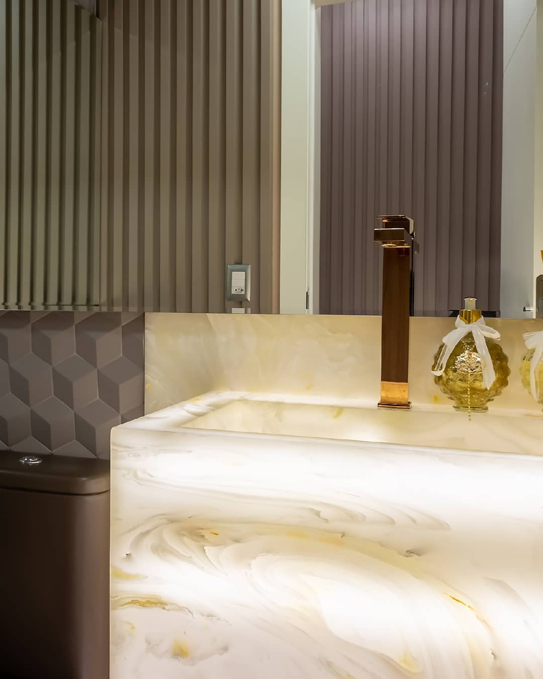 Lavabo com cores sóbrias, cuba de piso em ônix iluminado e revestimento 3D!