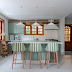 Com uma atmosfera de casa de campo, essa cozinha se destaca também pelas cores branco e verde menta, além de elementos super nostálgicos, como a fruteira de piso em madeira e as janelas, sem falar na ilha, as banquetas listradas e as luminárias que trazem mais atrativo ao decor do ambiente.